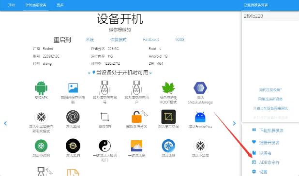 第二步:检测到设备后,点击右下角的「ADB命令行」,弹出选择界面选择CMD即可